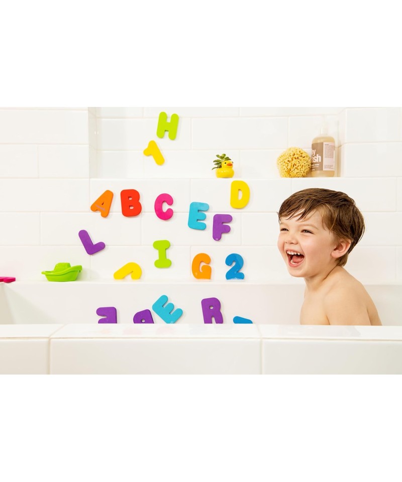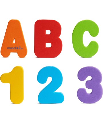 SET DE LITERE ȘI NUMERE MUNCHKIN PENTRU BAIE: Acest alfabet colorat pentru bebeluși include 26 de litere (A-Z) și 10 cifre mari (0-9) care plutesc și se lipesc de perete atunci când sunt ude.