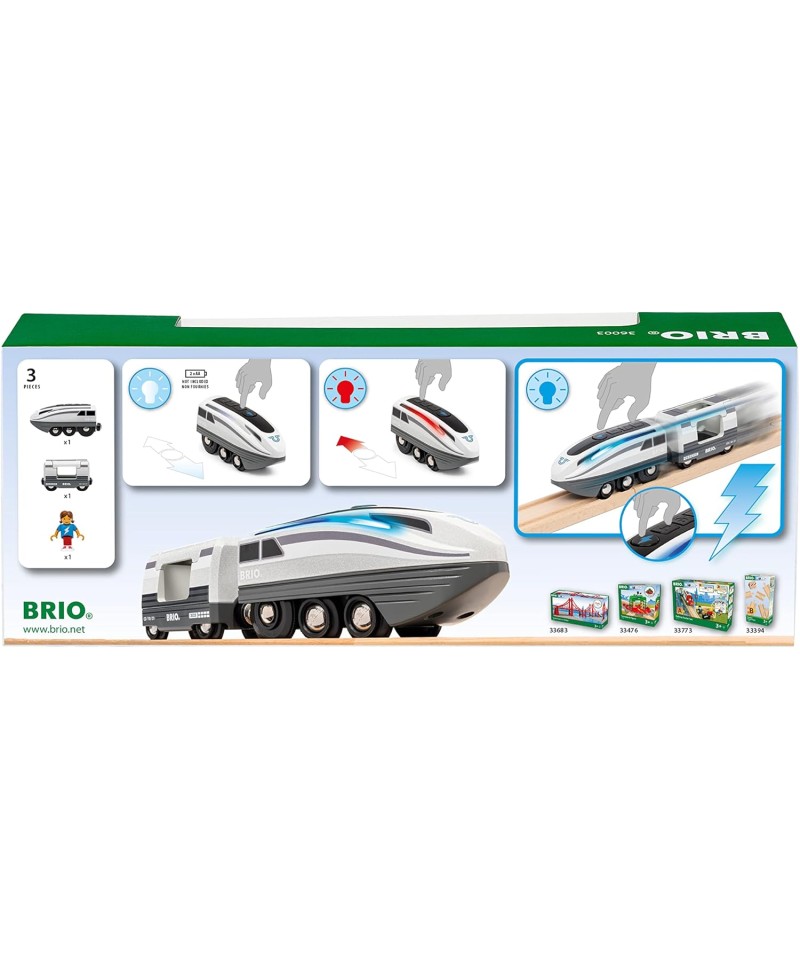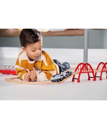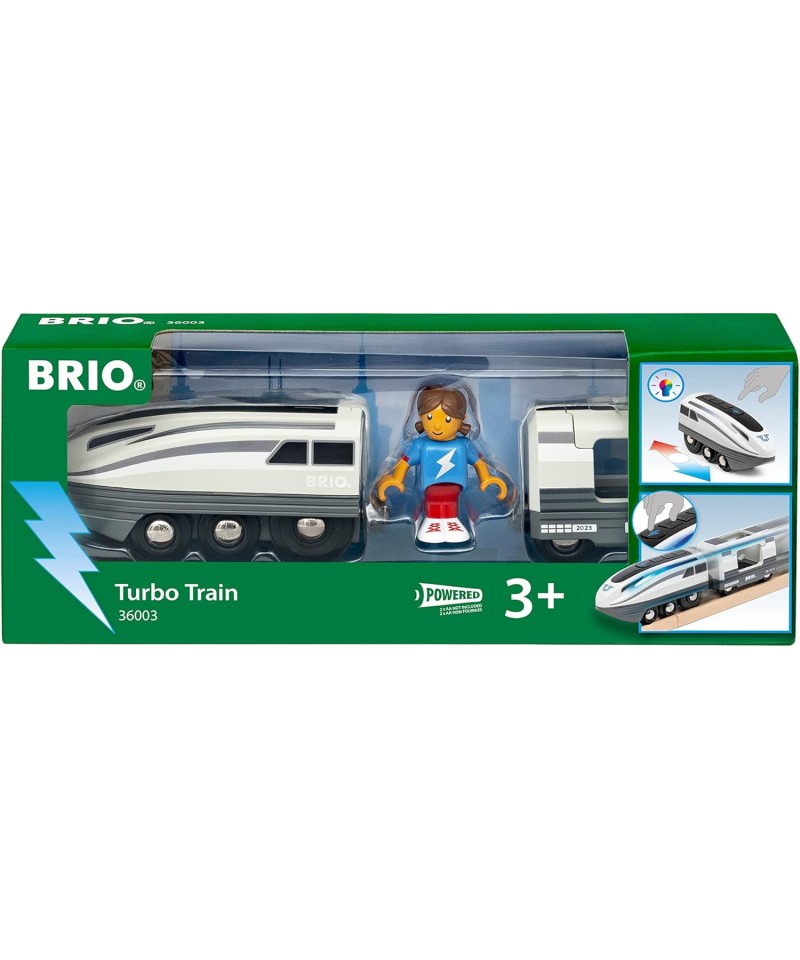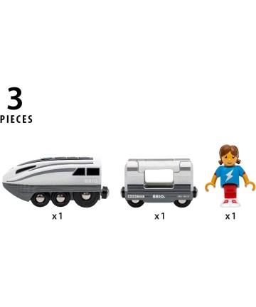 Setul conține: 1 x locomotivă turbo, 1 x vagon de pasageri, 1 x figurină pasager.
