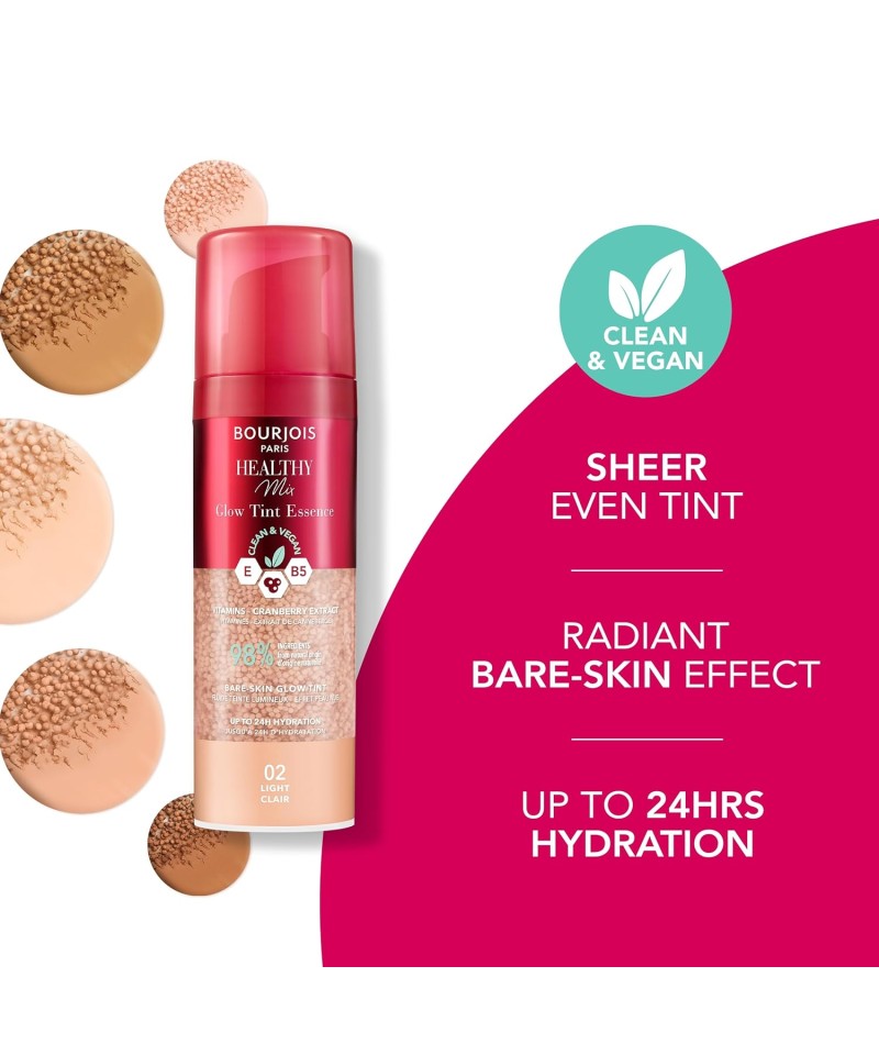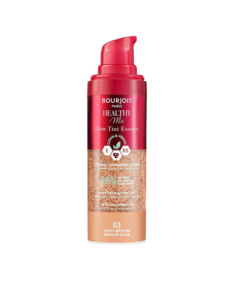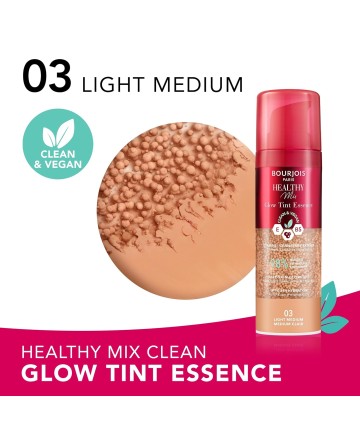 Menține o strălucire naturală, sănătoasă și radiantă, uniformizează culoarea pielii și bucură-te de un finisaj radiant cu Bourjois Healthy Mix Glow Tint Essence Essence.