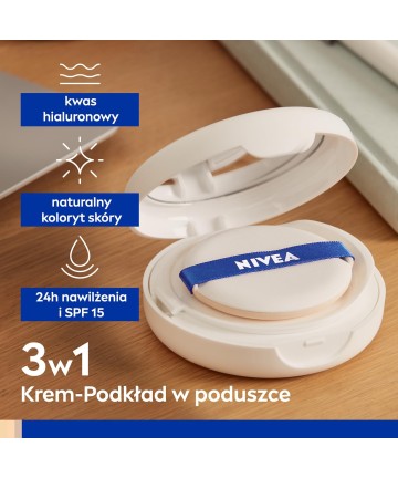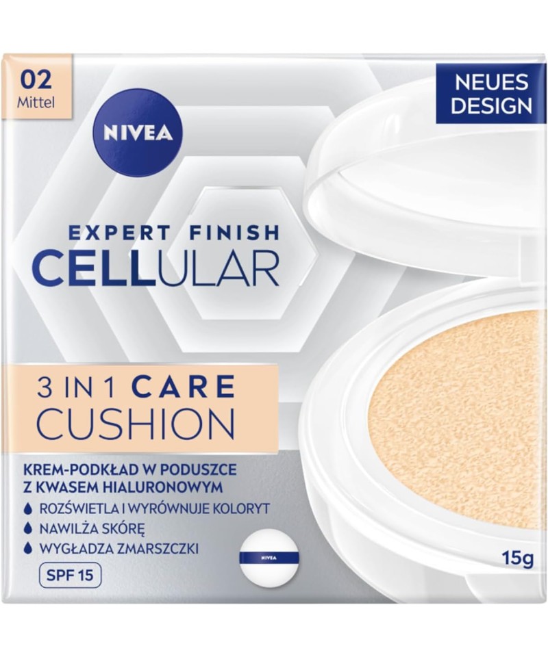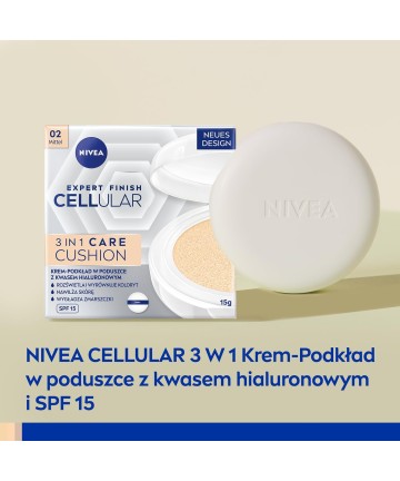 Fondul de ten NIVEA Cellular Expert Finish 3-in-1 CARE Cushion Anti-Wrinkle Cushion cu SPF 15 cu formula inovatoare îmbogățită cu acid hialuronic asigură un aspect tânăr al pielii. Celulele pielii sunt activate pentru a produce propriul acid hialuronic*.