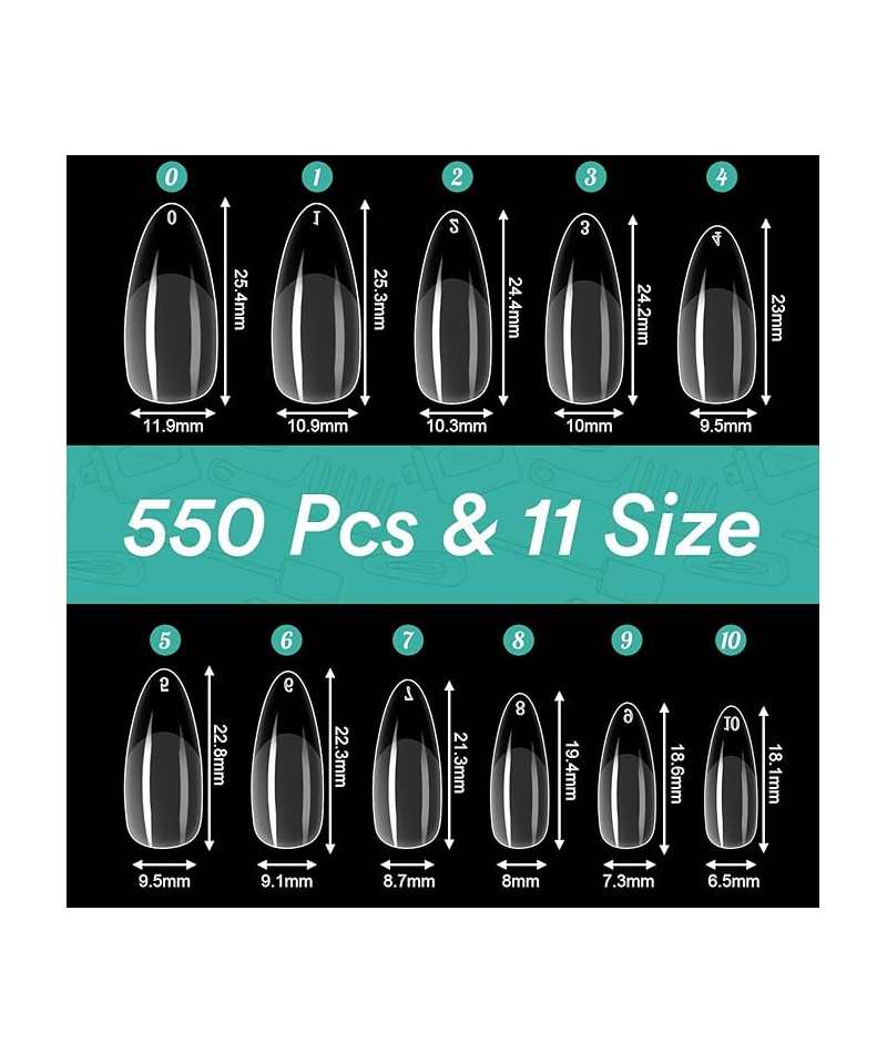 Opțiuni multiple de dimensiuni: Trusa de unghii false pentru fete include 11 dimensiuni diferite (550 de piese în total), numerotate de la 0 la 10, oferind o gamă largă de opțiuni pentru a se potrivi diferitelor dimensiuni ale degetelor. Poate satisface cu ușurință nevoile dvs.
