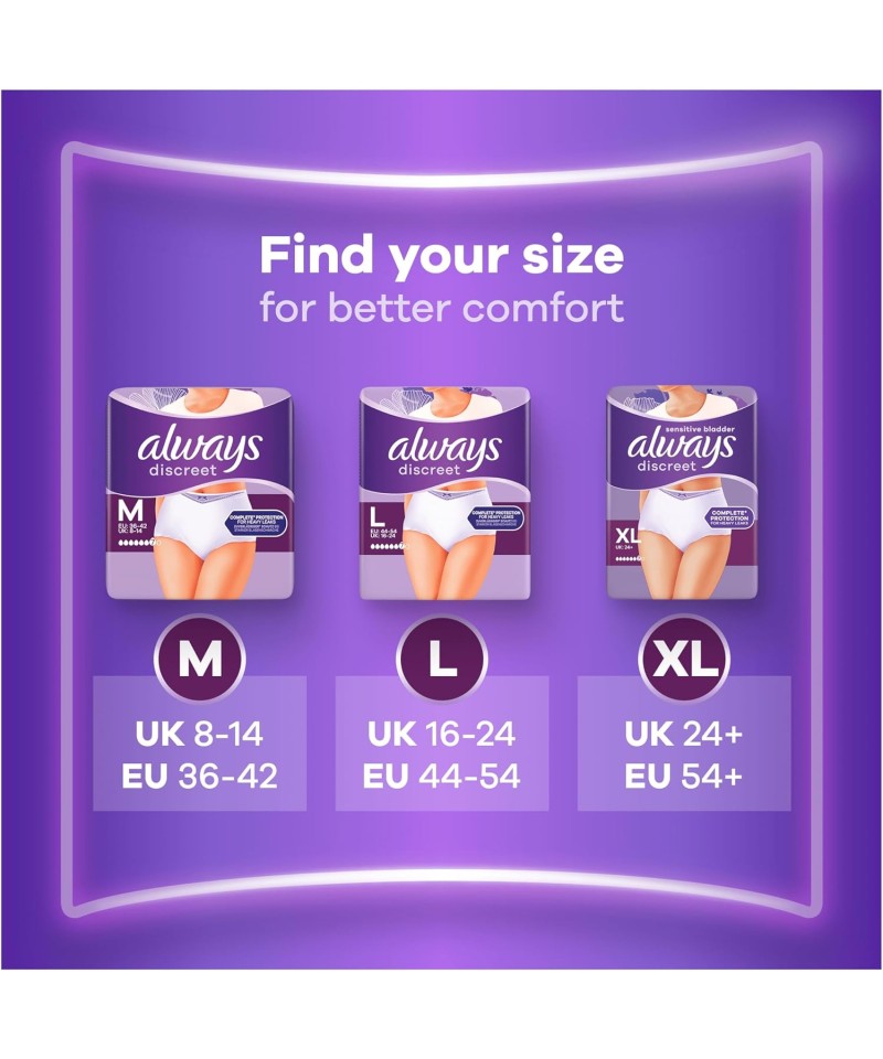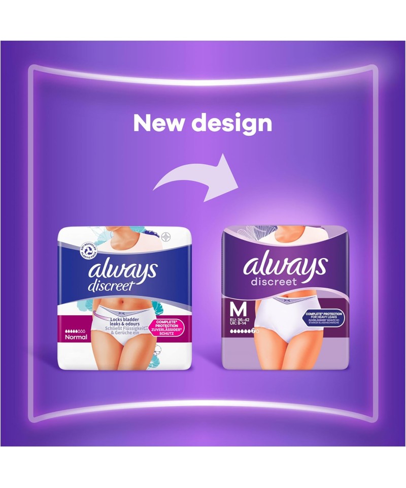 Chiloții de incontinență Always discreti, mărimea normală L, rămân la locul lor și te ajută să-ți trăiești viața la maximum, chiar și în cazul unor scurgeri de vezică semnificative și neașteptate.