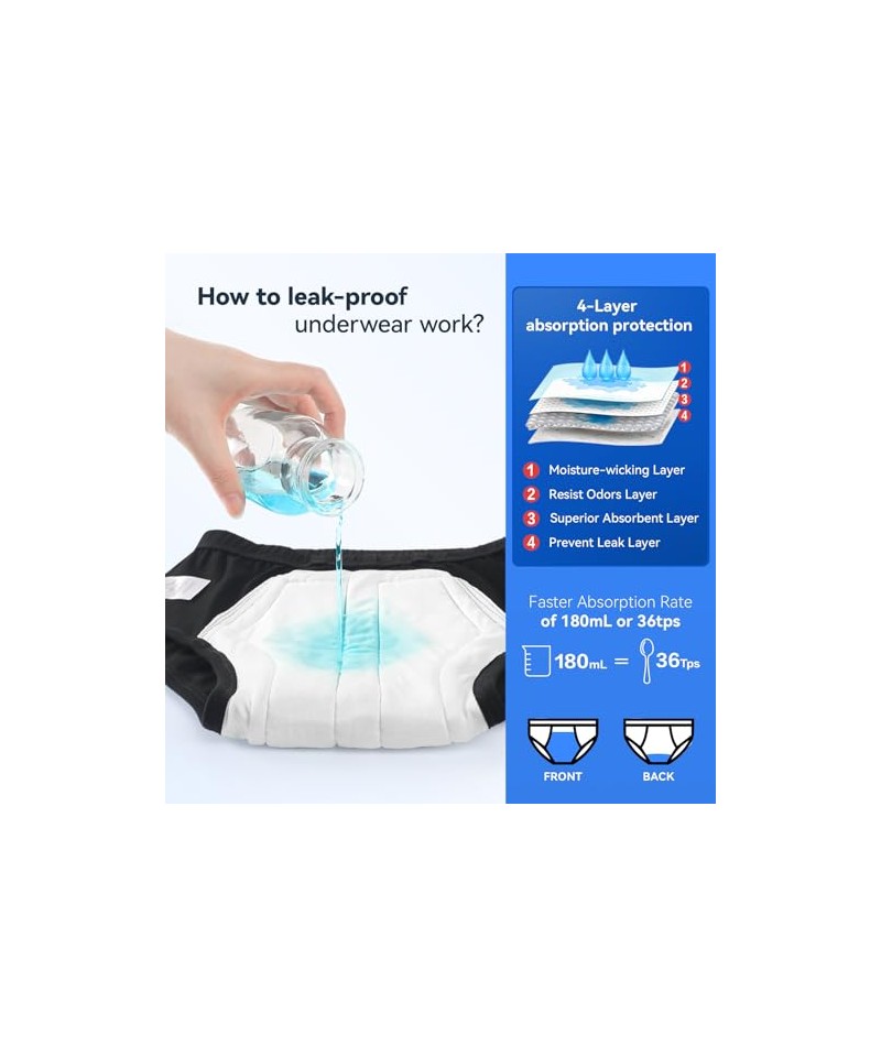 UȘOR DE ABSORBANT - Chiloții de incontinență pentru bărbați sunt mai ușor de absorbit decât tampoanele de incontinență și ajută la prevenirea scurgerilor în jurul picioarelor. Lenjeria intimă pentru incontinență urinară pentru bărbați poate preveni accidentele jenante, vă poate simplifica viața și vă poate crește încrederea în sine.