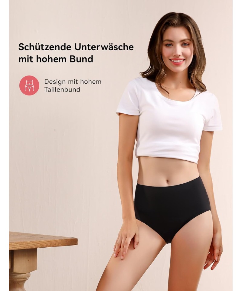 TALIE ÎNALTĂ: Lenjeria intimă menstruală are talia înaltă și se așază mai sus decât chiloții menstruali. Oferă o acoperire mai mare pentru șolduri și abdomen fără a aplica presiune.